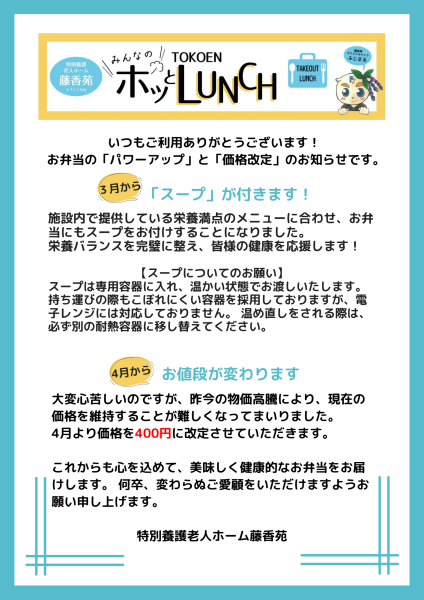お弁当の「パワーアップ」と「価格改定」のお知らせ